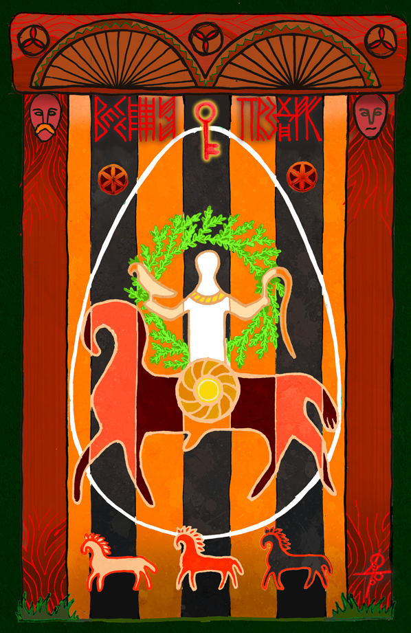 Пасха 1945 года была 6 мая, совпадая с православным Днём Григория Победоносца и предшествуя Дню Победы. У славян Григорию соответствует Ярило/Яровит. Картина Максима Сухарева "Весенний Праздник" Несмотря на то, что я сейчас буквально раздавлен заказами, - нечто для души. Причем тут не только 9 мая, хоть это и основной посыл, не скрою, но и 23 апреля (т.н. "день Ярилы Вешнего"), поэтому и такое название. Собирательный образ, в общем. И да, не совсем "классический", дохристианский Ярила-Яровит, а, скорее, св. Юрий-Егорий эпохи двоеверия. Впрочем, все те черты, которые раскрылись в более поздние эпохи, изначально присутствовали в данном Образе. (отсюда - http://vesemir.blogspot.nl/2017/05/blog-post.html) Картина Максима Сухарева "Певун" Здесь я вроде бы опять пытаюсь экспериментировать, хотя по стилю и цветовой гамме это все равно очень похоже на некоторые мои прошлые работы (например, "Внук Стрибога" или "Добрыня и Змея").